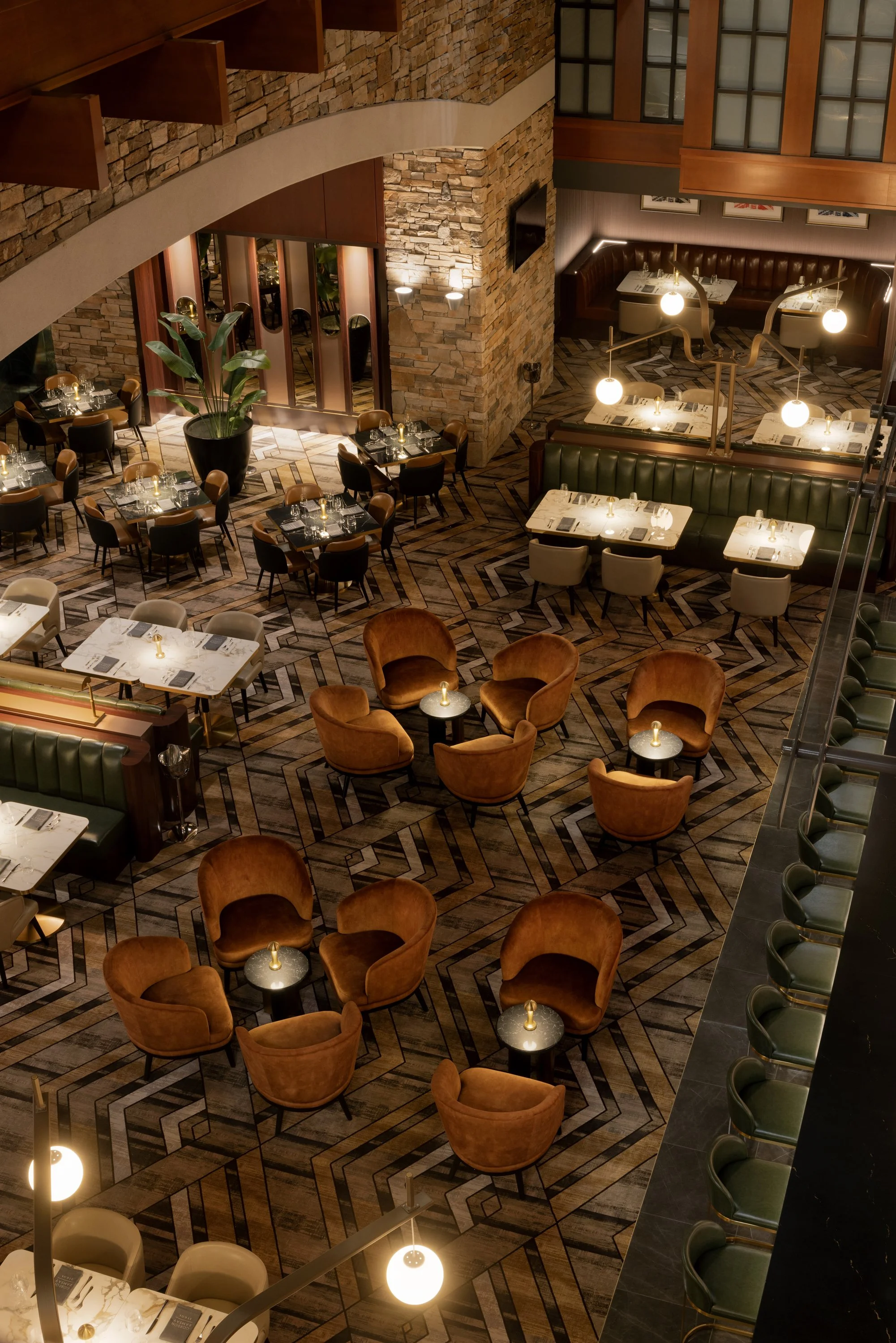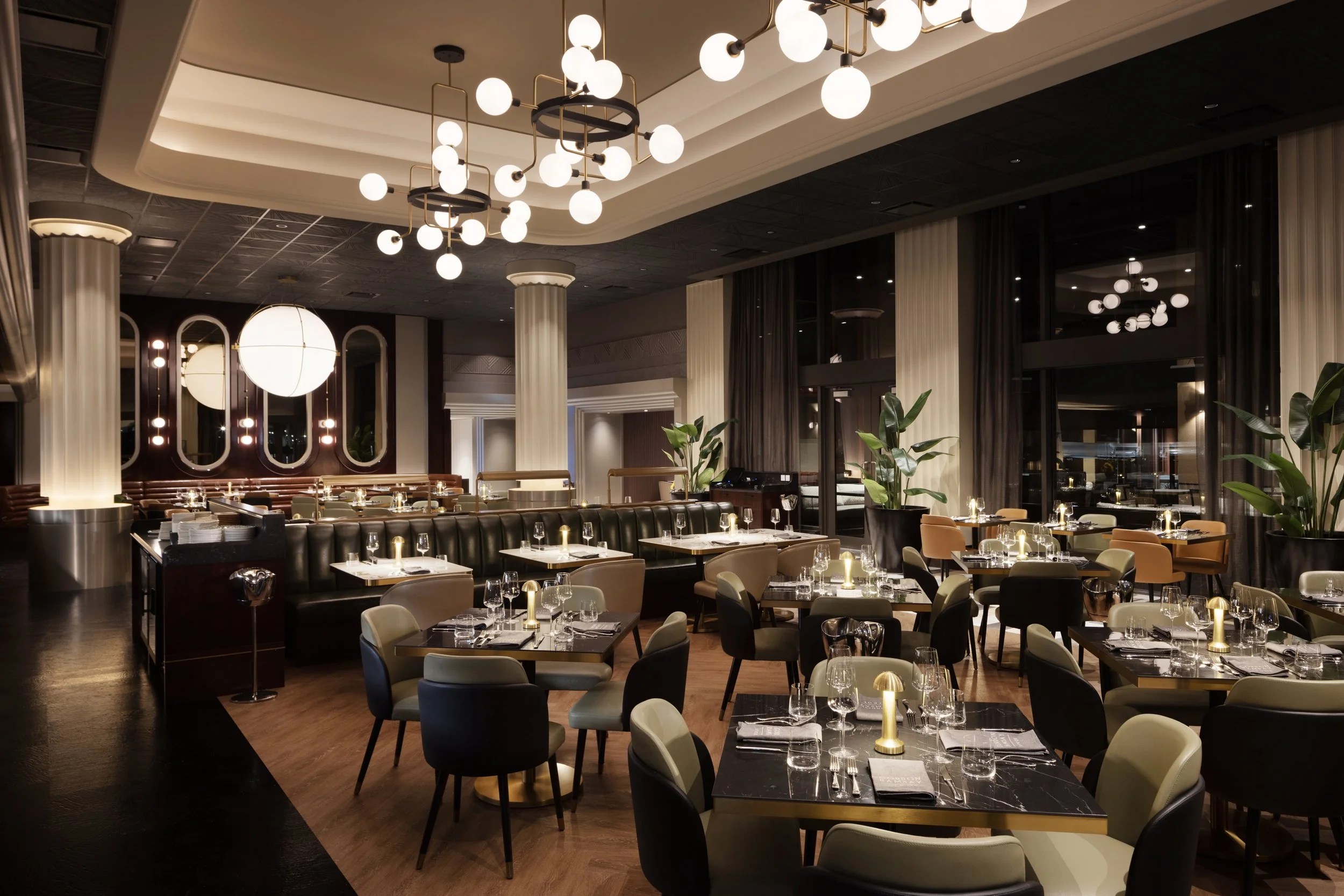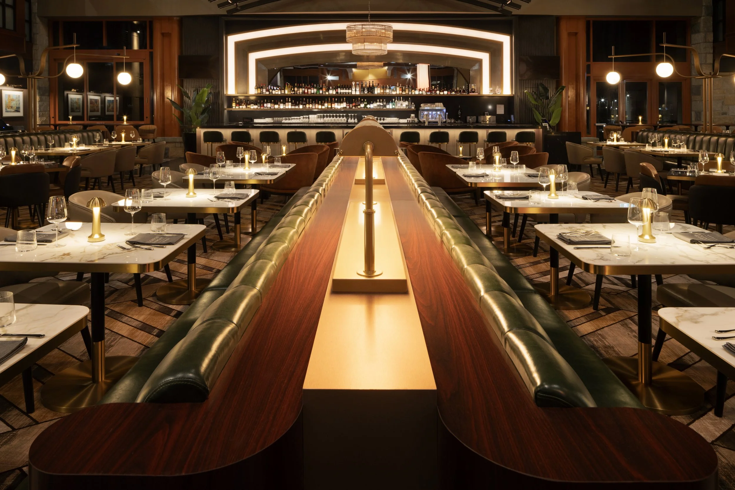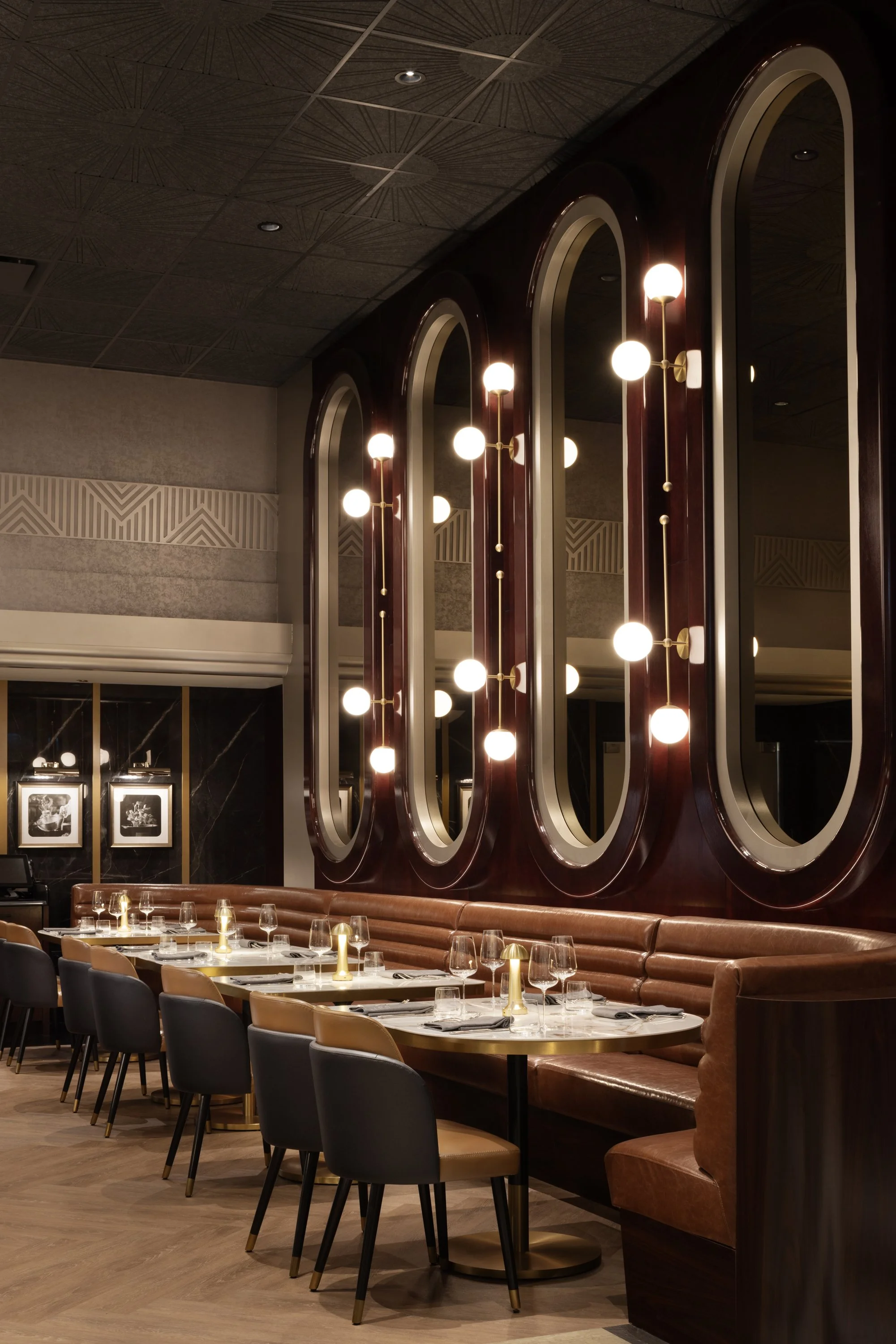 We tapped into the Streamline Moderne design style for the aesthetic concept of the restaurant. Emerging from the 1933 Chicago World Fair, Streamline Moderne's characteristic long lines, metallic finishes, and smooth curves marked a sleek, forward-thinking look.