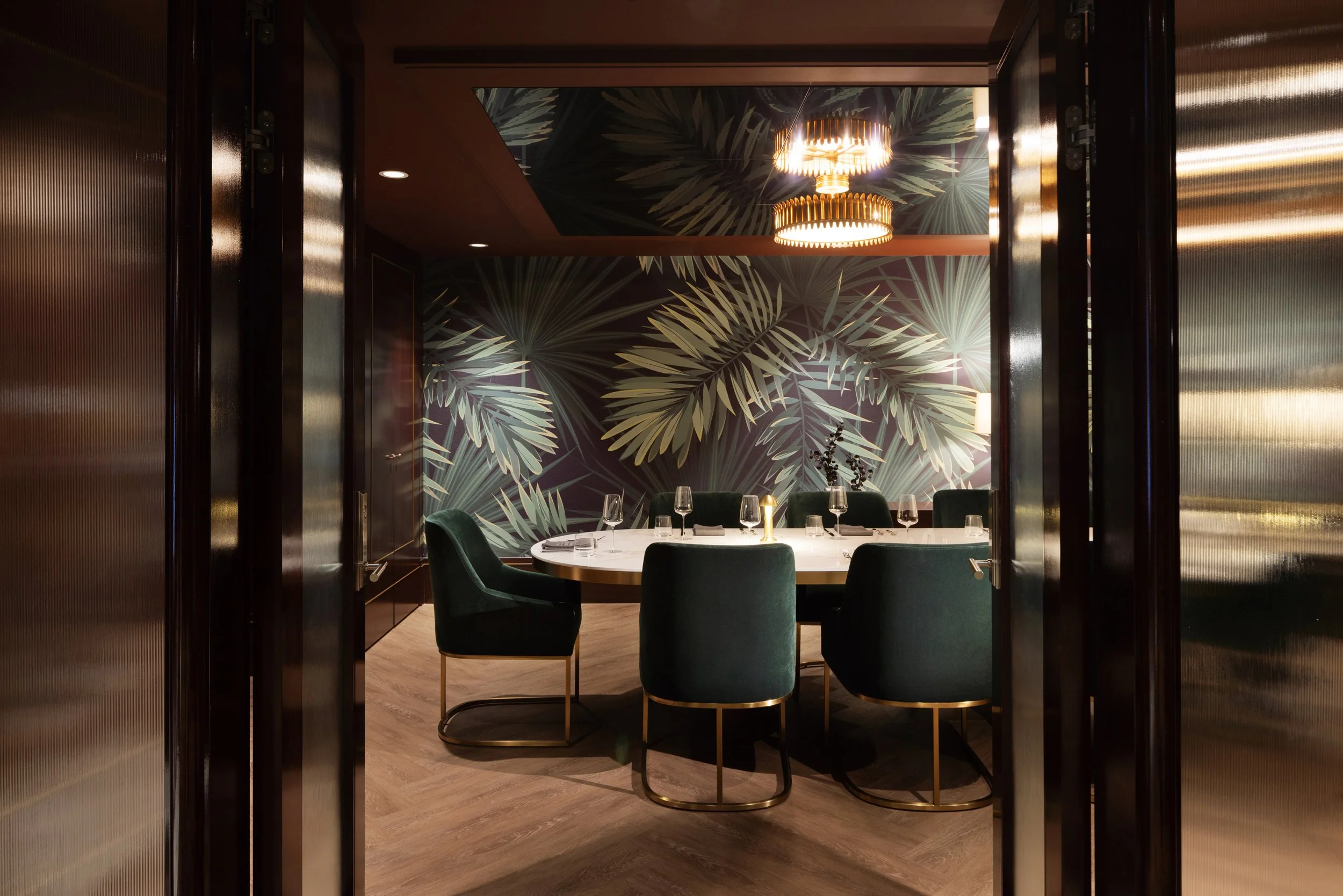 The private dining room exudes the luxe experience of retreating with one's inner circle for a cigar after dinner. Vintage elegance is found in the mahogany wall panels, brass light fixture, emerald velvet upholstery, and dimensional wallpaper with a palm motif that was popular in the 1940s. Previously a conference room, the space is restricted with a low ceiling, so we lined it with a dark mirror to expand and reflect these stunning features.