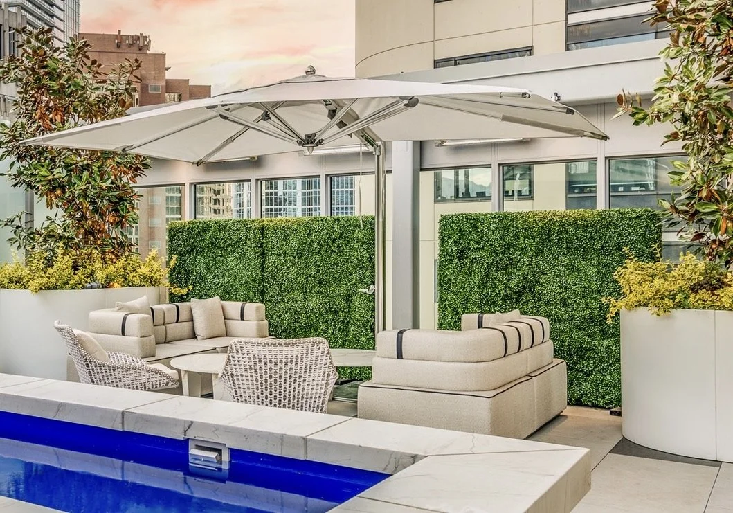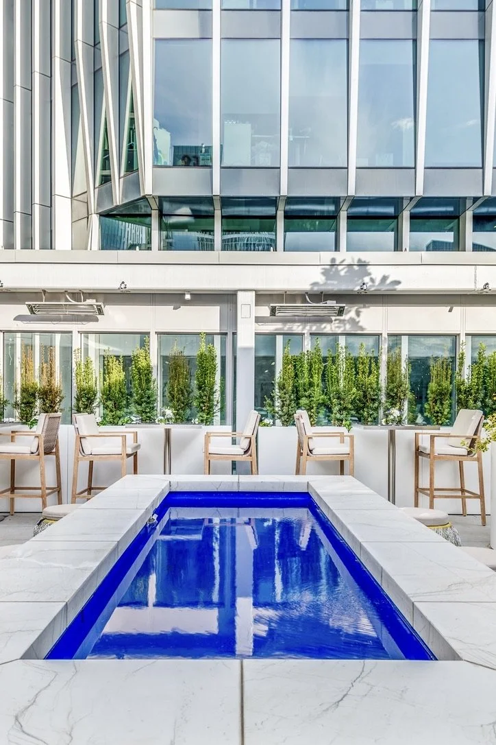 This intimate oasis is landscaped with planters and five full trees, softening the stunning views of the surrounding city. A variety of seating accommodates cocktails with friends or cozying up for a morning coffee with breakfast to gaze out on the mosaic-lined reflective pool.